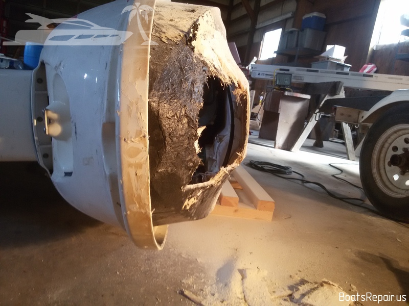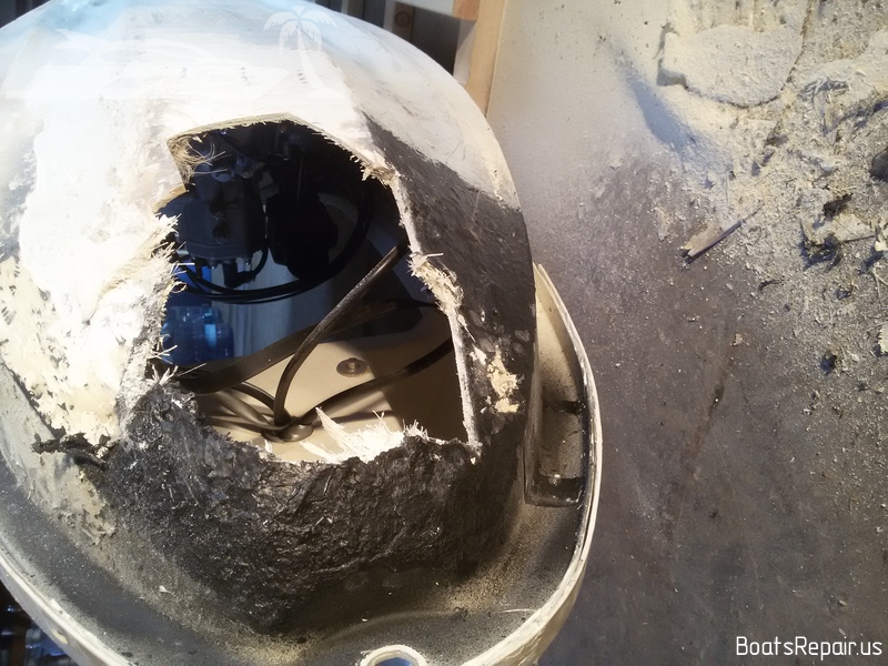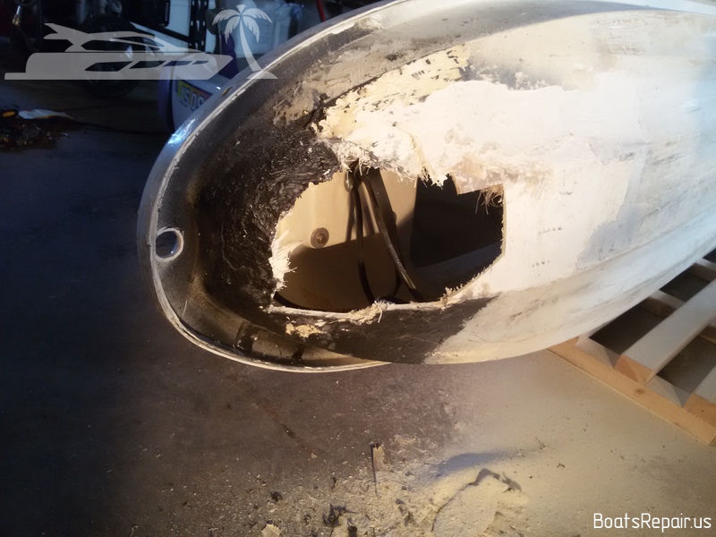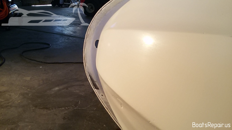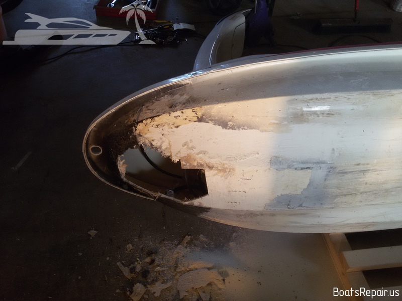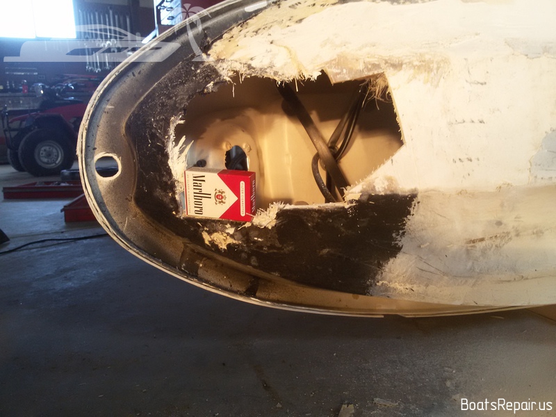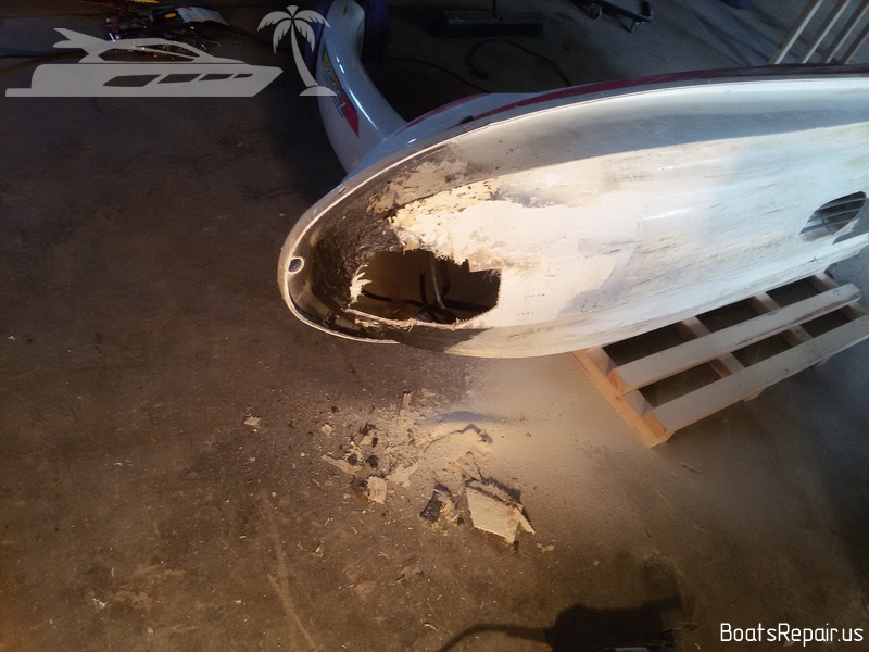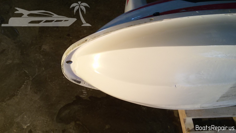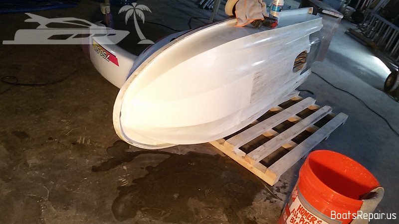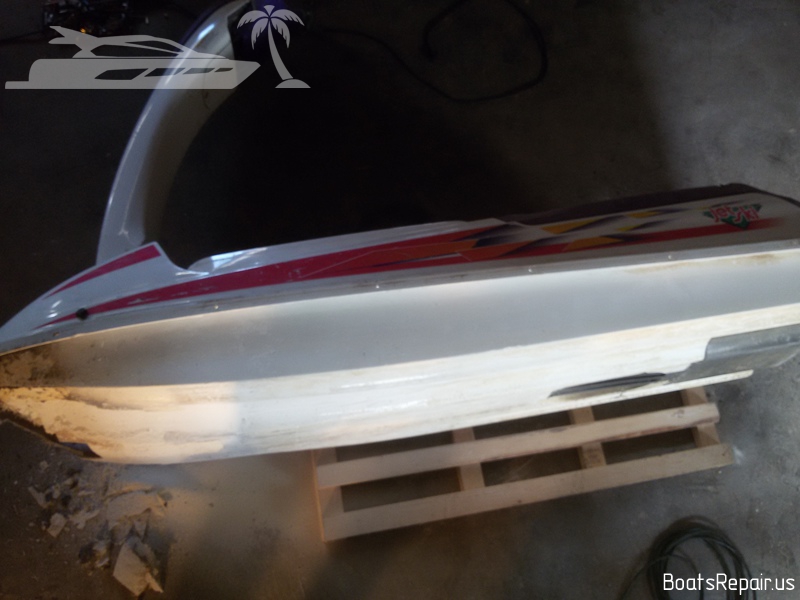 A Stand Up jetski Kawasaki was old and has seen a lot in his life. This poor guy has caught a lot of stones and shores during his long life and it has had more than one "quick" repair of the bow. When we were given this poor guy, his whole front part was covered with a kind of rubber layer with filling, a variety of glues and other rubbish under it. This jetski is very dear to our client and he asked to repair it as qualitatively as possible. We took out the fuel tank from the front part of the hull and began to remove from the damaged part of the hull everything, that was not fiberglass and gel coat. The result was a very impressive hole. The water was very deeply absorbed into the damaged fiberglass, and we had to cut off these parts in order to completely eliminate moisture in the layers of the hull. Then we completely restored the shape and strength of the hull, using only fiberglass and polyester resin. Then we covered the place of repairing with gel-coat and polished a little. The result you can see in the photos. We think we gifted a second life to this jetski. |