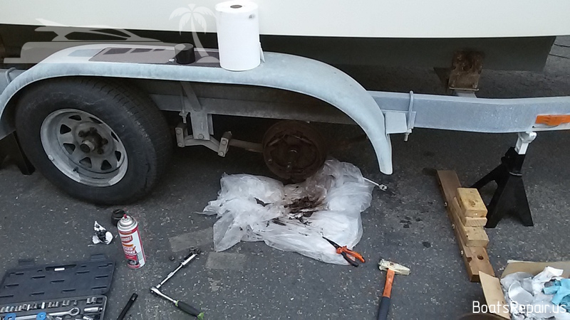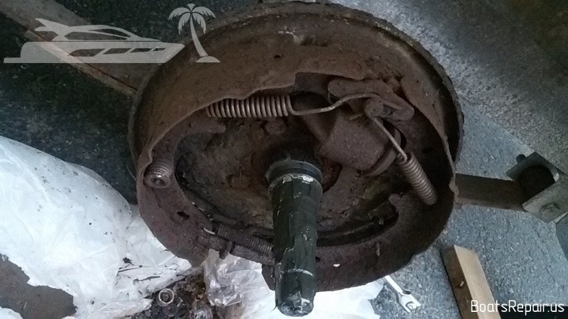 Sometimes you should think, why, when you tow a 23ft boat on a trailer behind your truck and when you press the brake pedal, the loaded trailer hits your car from behind and doesn't want to stop. The problem is quite popular. Some guys who have a boat on the trailer forget to inspect and maintain the trailer. They think that the trailer is needed to throw the boat on the water and then load it back. Your trailers, all of them, even the most expensive and high-quality, constantly contact with the water. This is detrimental to all parts of your trailer. The exception is only the frame of the trailer. All other parts -electrical wiring, taillights, lodgements under the boat, all the bolts and nuts and wheels and brakes. After the customer complained about the poor braking quality of his trailer, we decided to remove one wheel and see what was going on. The result of the inspection is in the photos. Absolutely everything, that used to be called the braking system, undergone the strongest corrosion and fully rotted. Even the tube for the brake fluid turned to dust. We replaced the entire trailer braking system, starting with the main brake cylinder and ending with the brake pads. Brake drums, brake pads, brake pipes, wheel bearings and wheel hubs and much more details were replaced with new ones. The work took 3 days. One person worked. |